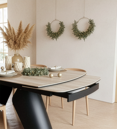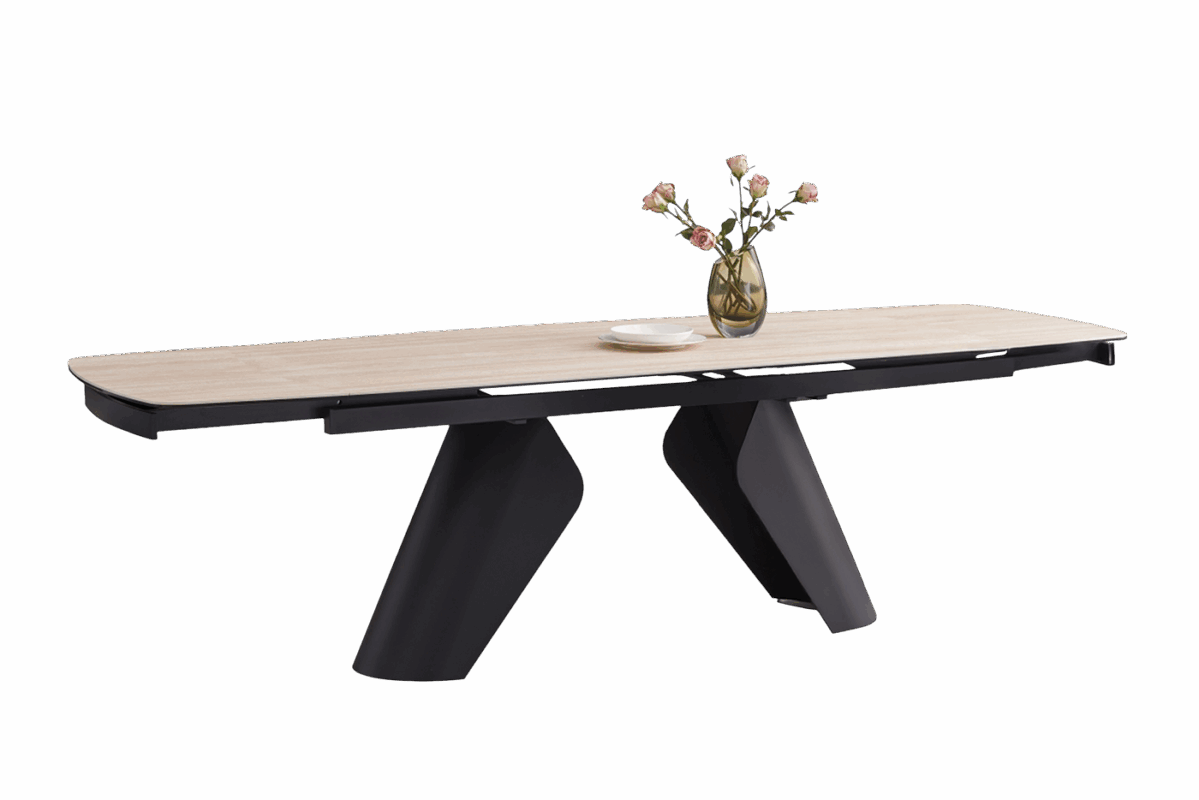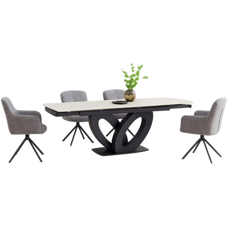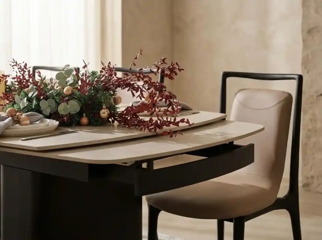 Valtor Dining Table memadukan sintered stone, kaca penguat, dan kaki metal powder coating yang kuat serta mudah dirawat.