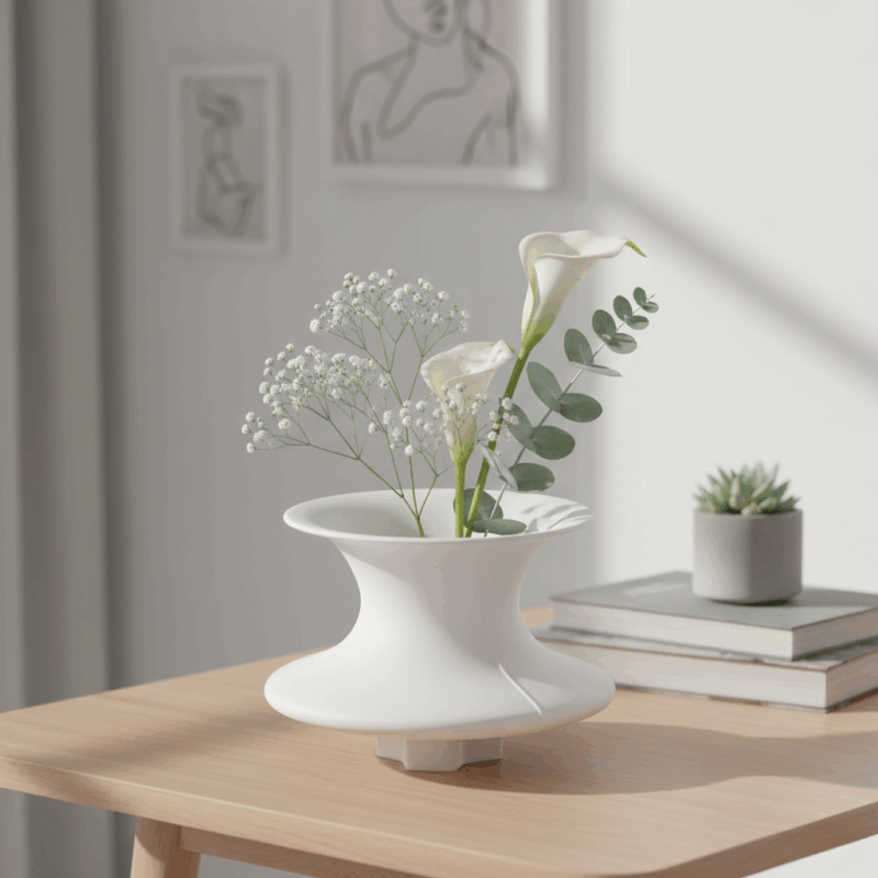With a form reminiscent of a modern hourglass silhouette, the Abspielen Ceramic Vase does not seek to dominate attention—yet it is precisely this quiet presence that allows it to stand out. Its clean matte white finish, soft curves, and carefully balanced proportions create a calming visual experience. It embodies harmony between simple lines and organic curves, becoming a symbol of how silence can be translated into aesthetic expression.