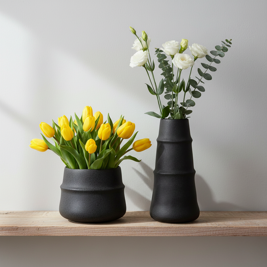 A black color of lycklig ceramic lets these ceramic vase bring depth and glow to the table. The new lycklig series alternates different surfaces: matt and glazed, grooved and smooth, creating an attractive dynamic.