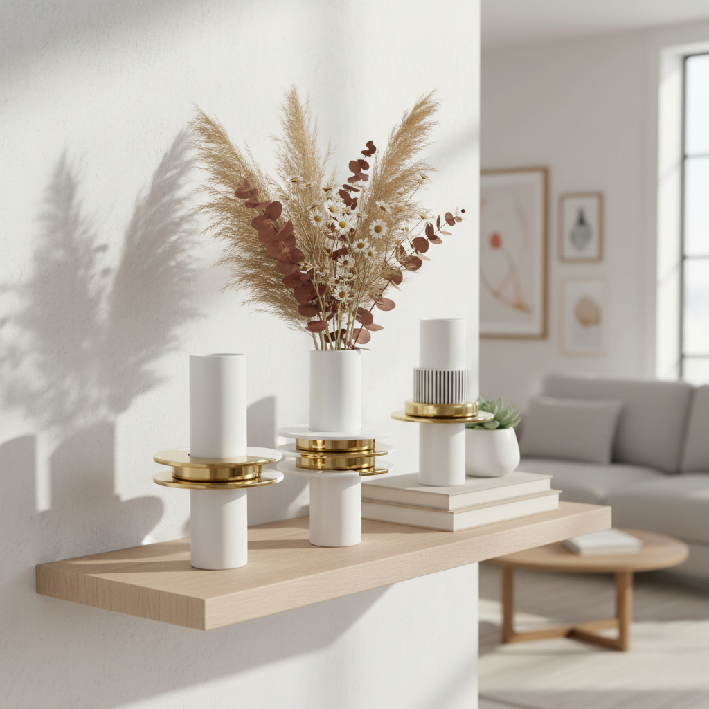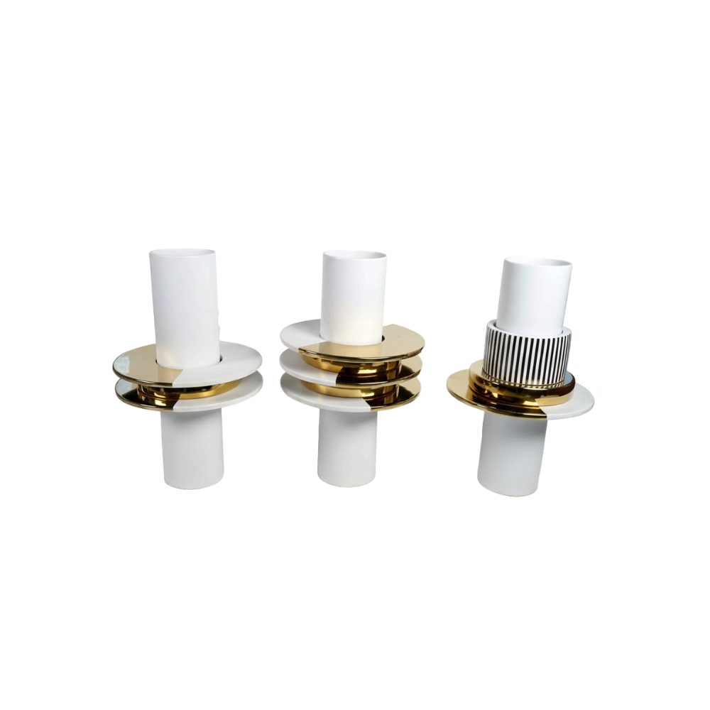 Cylinder and saucers stack geometric vases in elegance look. Combining natural white and classic gold for luxury decor, Schicht provides a high-contrast foundation for colorful flower arrangement.