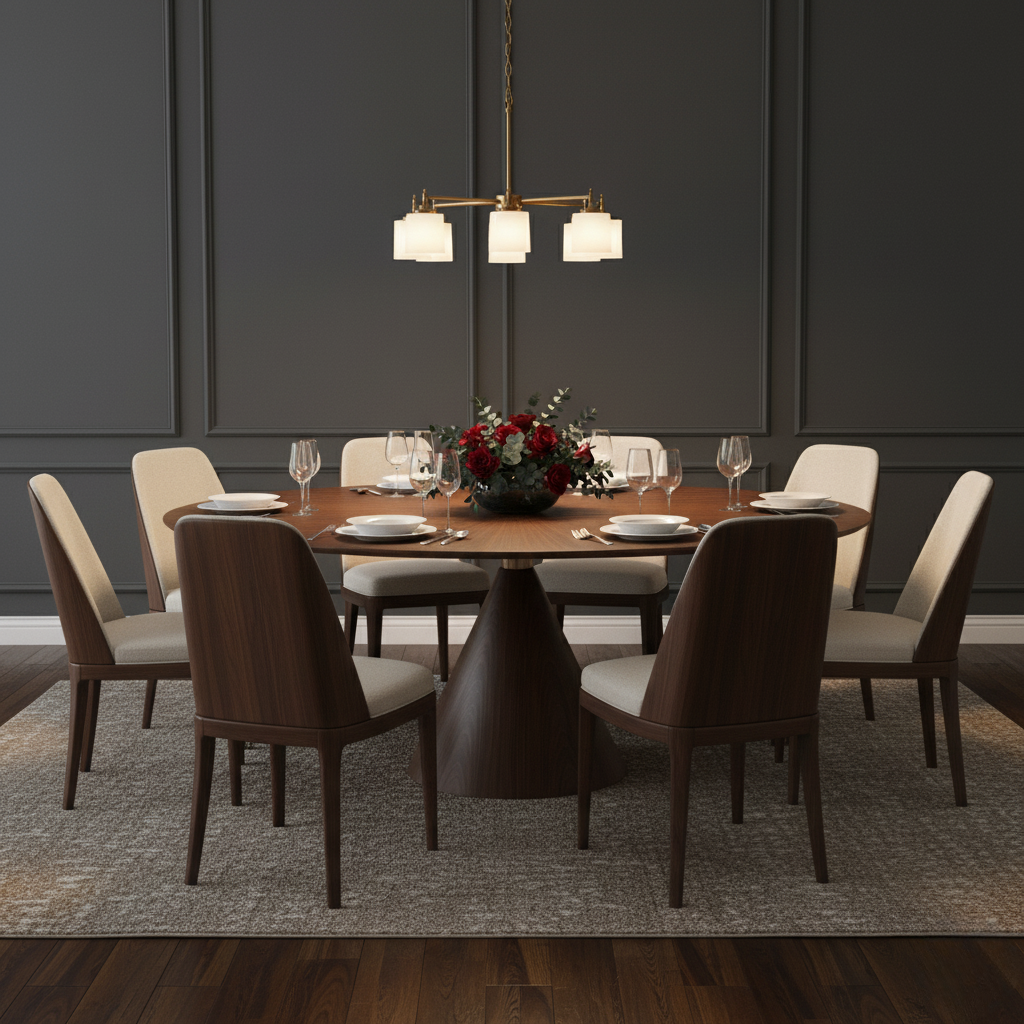 - Ergonomic Design: Proporsi yang seimbang dirancang khusus untuk memberikan ruang kaki yang maksimal dan kenyamanan duduk yang optimal — cocok untuk makan malam intim maupun acara sosial yang berlangsung lama.