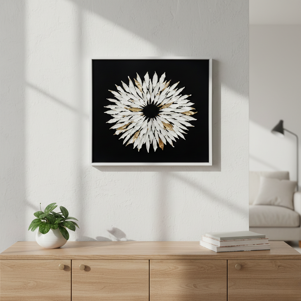 Pola menyerupai bunga dengan kelopak berlapis-lapis tampak seperti meledak dari pusat lingkaran, menghasilkan efek tiga dimensi yang dramatis namun tetap elegan. Warna putihnya tampak seperti serpihan batu kristal, sementara aksen emasnya memantulkan cahaya dengan lembut. Semua itu direkatkan pada panel dengan latar hitam matte yang memberi kesan mewah tanpa kemewahan yang berlebihan—cukup untuk membuat mata terpikat, namun tetap selaras dengan berbagai gaya interior.