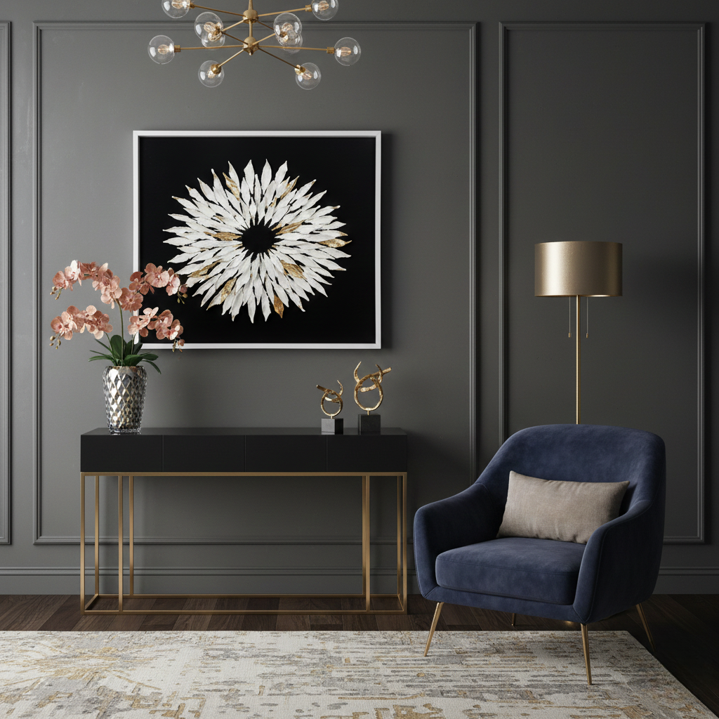 Latar hitam pekat berfungsi sebagai kanvas yang sempurna, membuat warna putih dan emas tampak semakin hidup, bersinar, dan dramatis. Dari kejauhan, Arquette Seni Dinding B tampil seperti simbol cahaya yang kuat. Dari dekat, detail teksturnya mengungkap ketelitian, presisi, dan kualitas artistik yang jarang ditemukan pada dekorasi dinding biasa. Karya ini tidak membutuhkan pendamping—kehadirannya sendiri sudah cukup untuk menjadi pusat perhatian, pusat percakapan, dan pusat keindahan dalam sebuah ruang.