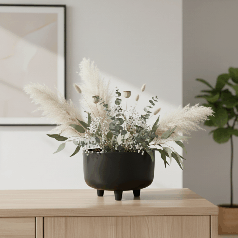 Finishing matte hitamnya memberikan sentuhan misterius namun hangat—sebuah karakter unik yang membuatnya mudah menyatu dengan berbagai warna dan tekstur interior. Tiga kaki kecil yang menopang tubuh vas bukan hanya elemen visual yang unik, tetapi juga konstruksi fungsional yang memastikan vas berdiri kokoh dan tidak mudah goyah. Perpaduan desain ini menciptakan sentuhan galeri modern yang timeless.