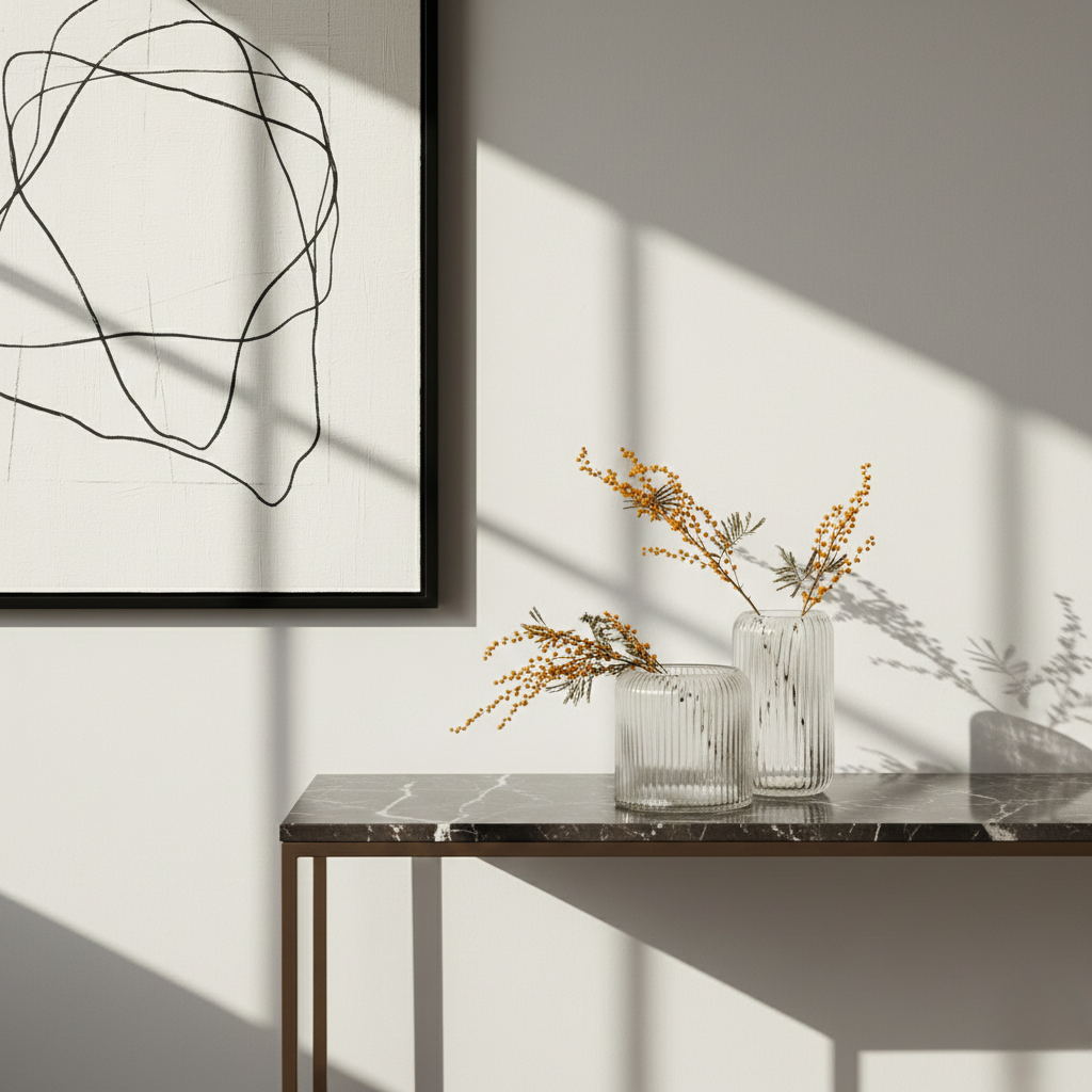 Pajangan Artistik: Dipasangkan dengan buku, keramik, atau lilin di rak untuk menciptakan komposisi berlapis yang seimbang.