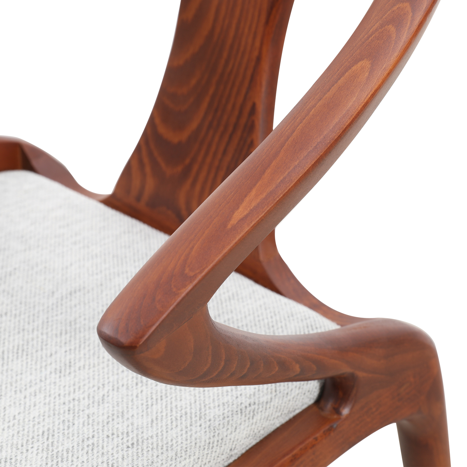 The Eira Armrest Dining Chair is a sophisticated fusion of classic craftsmanship and contemporary elegance, designed to enrich both the aesthetic and functional aspects of your living space. Built from solid beech wood and finished with a fabric-covered seat, it strikes a harmonious balance between durability, comfort, and visual appeal.