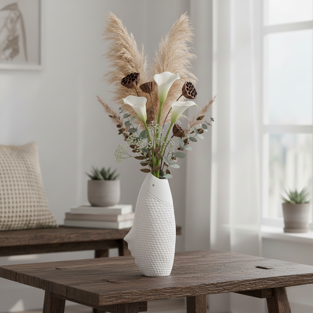 Di sinilah Fisch Vas Keramik menjadi solusi elegan. Dengan desain artistik menyerupai figur ikan yang harmonis, keramik matte putih yang bersih, serta tekstur detail yang memancarkan rasa tenang dan eksklusif, vas ini mengembalikan identitas visual ke dalam ruang. Ia menjadi titik fokus yang tidak hanya memperindah ruangan, tetapi juga menambah kedalaman cerita dan kehangatan estetika.