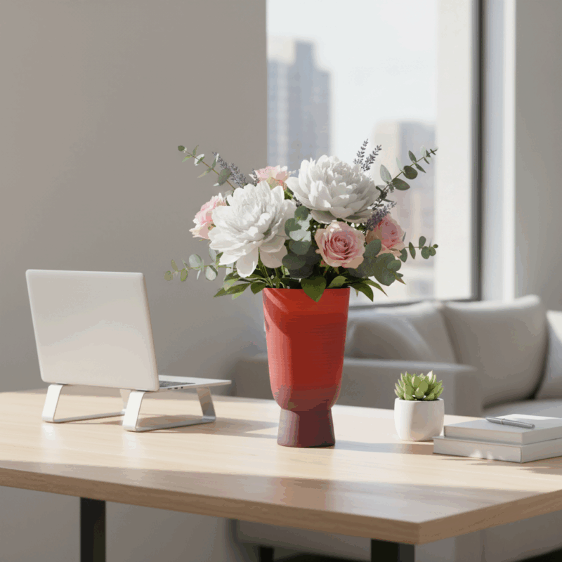 Dari kebutuhan tersebut lahirlah Grimmie Vas Keramik, sebuah vas yang tidak hanya mengisi ruang, tetapi menyempurnakannya. Menghadirkan palet warna hangat berupa gradasi merah terarah menuju ungu gelap yang menenangkan, bentuknya yang ramping dan modern terasa begitu harmonis dengan konsep hunian masa kini. Grimmie Vas Keramik bukan hanya objek dekoratif—ia adalah simbol dari ketelitian, kelembutan estetika, dan kekuatan karakter sebuah ruang.