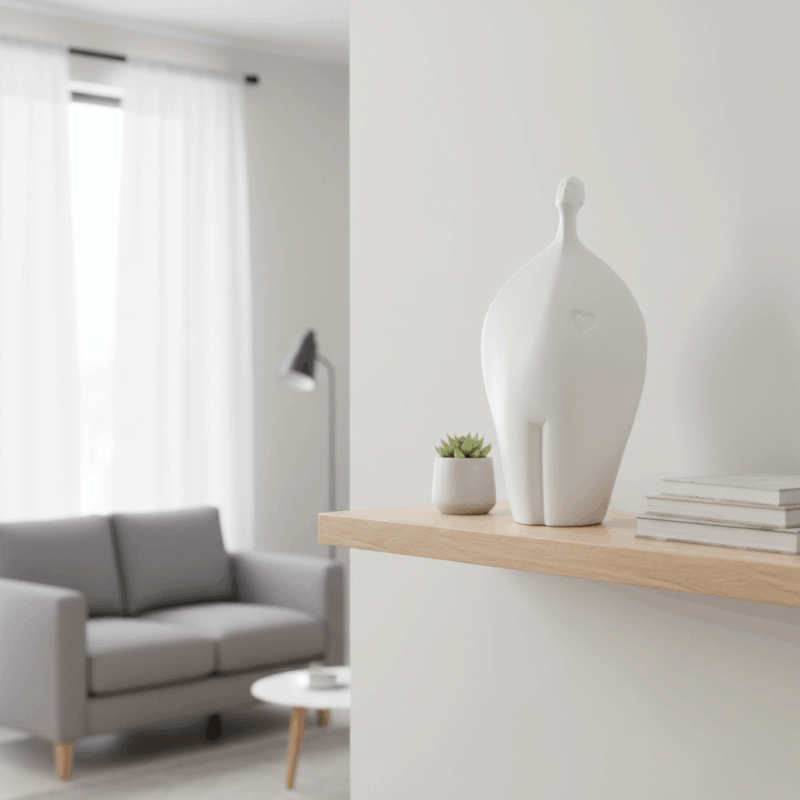 Ich Dekorasi Patung Manusia tercipta untuk memenuhi kerinduan itu. Patung keramik putih ini memiliki siluet yang sederhana namun mendalam: bentuk tubuh membulat yang menyerupai kepompong kehangatan, hadir dengan detail hati kecil yang ditekan lembut pada bagian dada. Simbol kecil ini memberikan sentuhan emosional yang begitu kuat—seolah figur ini membawa pesan tentang cinta, ketenangan, dan penerimaan diri. Dengan karakter desain yang minimalis namun sarat makna, Ich Dekorasi Patung Manusia bukan hanya pelengkap visual, tetapi juga representasi dari kehangatan batin yang ingin kita hadirkan di rumah.