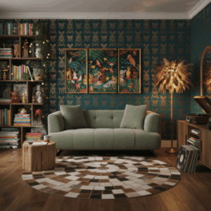 Living Room yang Nyaman – Warna hijau melengkapi kayu alami, tanaman, dan pencahayaan lembut.