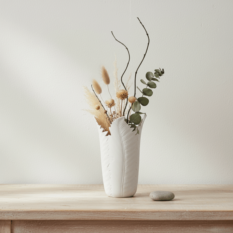 Lahti Vas Keramik Putih bukan sekadar vas; ia adalah representasi dari filosofi bahwa keindahan harus menyatu dengan kualitas yang tidak tergoyahkan. Pada pandangan pertama, tekstur daun yang mengalir memberikan kesan lembut dan natural, seolah terukir langsung dari bilah daun segar. Namun di balik estetika organiknya, tersembunyi struktur kokoh berbahan keramik berkualitas tinggi yang menawarkan ketahanan luar biasa.