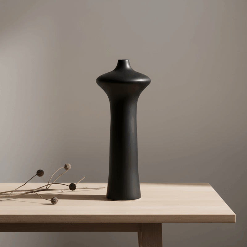 Keramik yang digunakan memiliki kepadatan tinggi, memberikan bobot yang terasa solid saat disentuh dan memastikan vas berdiri kokoh. Proses pembakaran bertahap pada suhu tinggi menghasilkan struktur yang padat, tidak mudah retak, dan lebih tahan terhadap perubahan suhu serta kelembapan. Finishing hitam doff diaplikasikan secara merata untuk menciptakan tekstur halus yang menyerap cahaya dengan lembut—menghasilkan tampilan yang tenang, dalam, dan eksklusif.