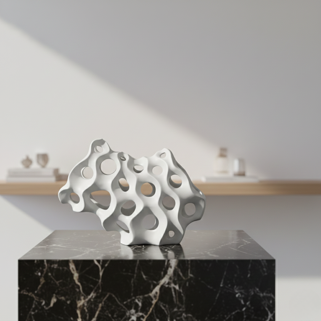Dekorasi ini dapat menjadi titik fokus di ruang tamu, elemen penyeimbang visual di ruang keluarga, atau aksen artistik di meja konsol. Warna putih matte yang netral memberikan kebebasan untuk dipadukan dengan berbagai warna furnitur dan tekstur interior, termasuk kayu, marmer, batu alam, atau logam.
