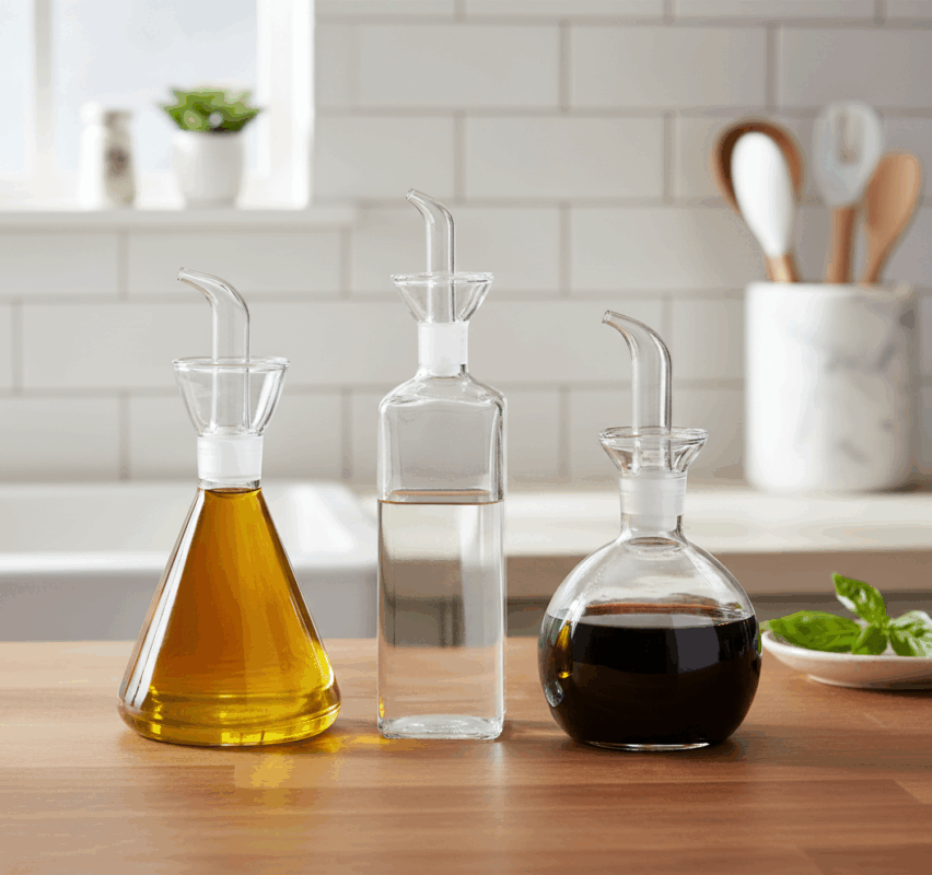 Ada banyak dari kita yang masih menggunakan botol bawaan pabrik untuk minyak, cuka, kecap cair, atau saus favorit. Botol-botol itu sering kali tidak proporsional, mudah licin, sulit menuang, dan sama sekali tidak estetis jika diletakkan di atas meja. Selain rinciannya yang kurang menarik, pengalaman menyajikan juga menjadi tidak nyaman—terlalu banyak tumpahan, minyak yang menetes di dinding botol, serta bentuk yang mengganggu harmoni interior dapur Anda.