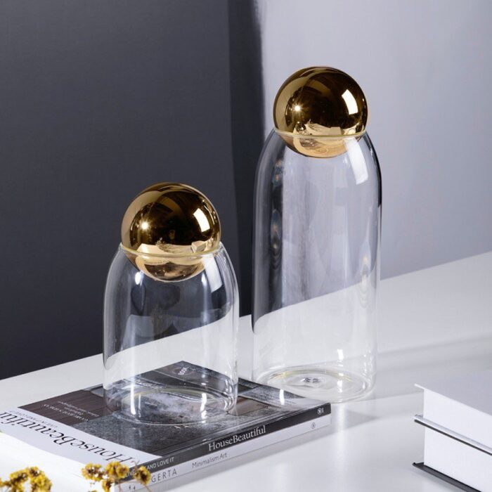 Lalu hadir Schwimmend Gelas Kaca, sebuah karya yang lahir dari perpaduan kejernihan kaca bening dan ketegasan kubah emas yang memukau. Siluetnya yang tinggi dan melengkung lembut, dipadukan dengan tutup berbentuk setengah bola berwarna emas yang memantulkan cahaya, membuatnya tampak seperti patung modern yang dihadirkan ke dalam ruang Anda. Ini bukan sekadar jar, bukan sekadar vas—namun sebuah objek seni yang menghadirkan dinamika visual melalui refleksi cahaya dan bentuk yang elegan. Tersedia dalam dua ukuran, yaitu Sedang dan Besar, Schwimmend Gelas Kaca memberikan keleluasaan bagi Anda untuk menciptakan harmoni visual, baik digunakan secara tunggal maupun dipasangkan untuk tampilan yang lebih dramatis.