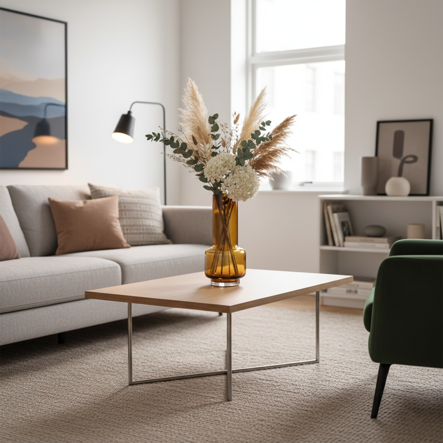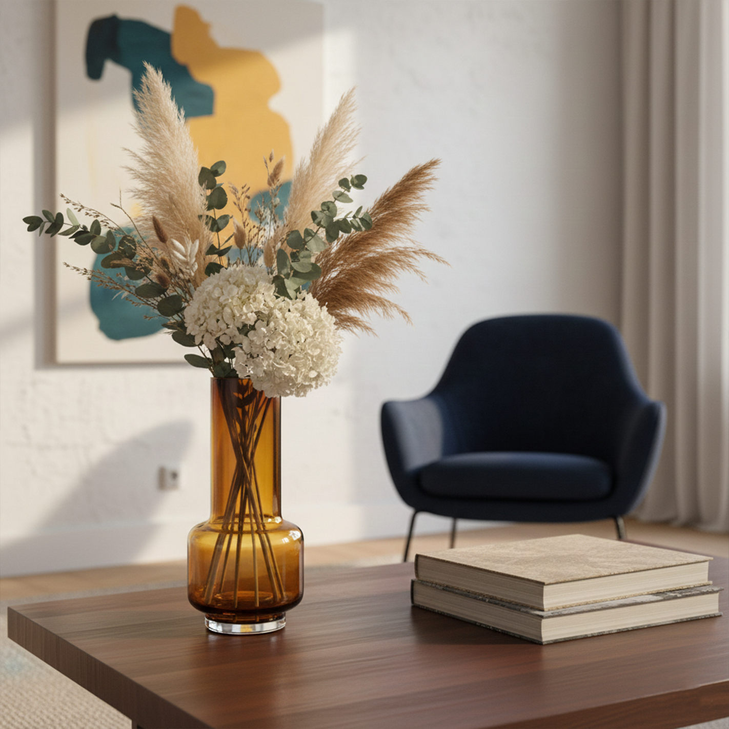 - Ruang tamu: sebagai pusat perhatian di meja kopi atau side table.