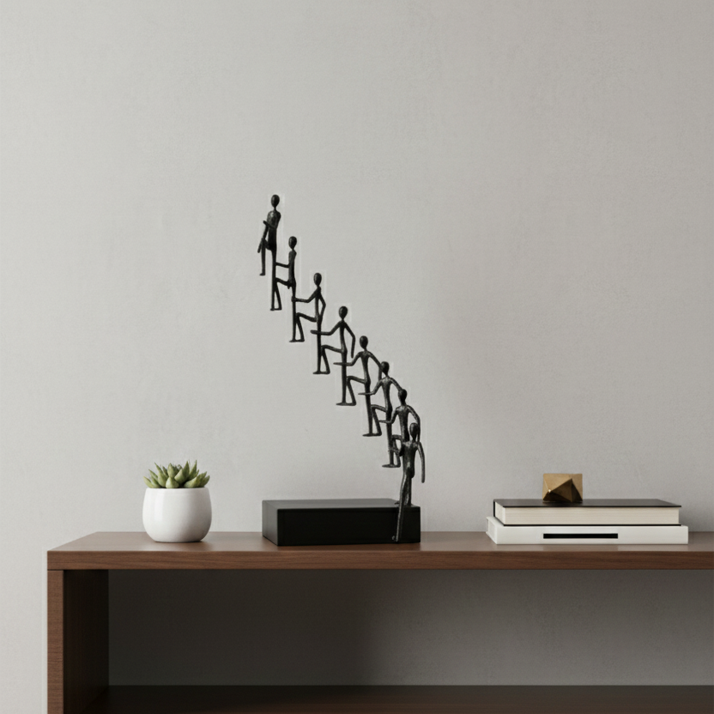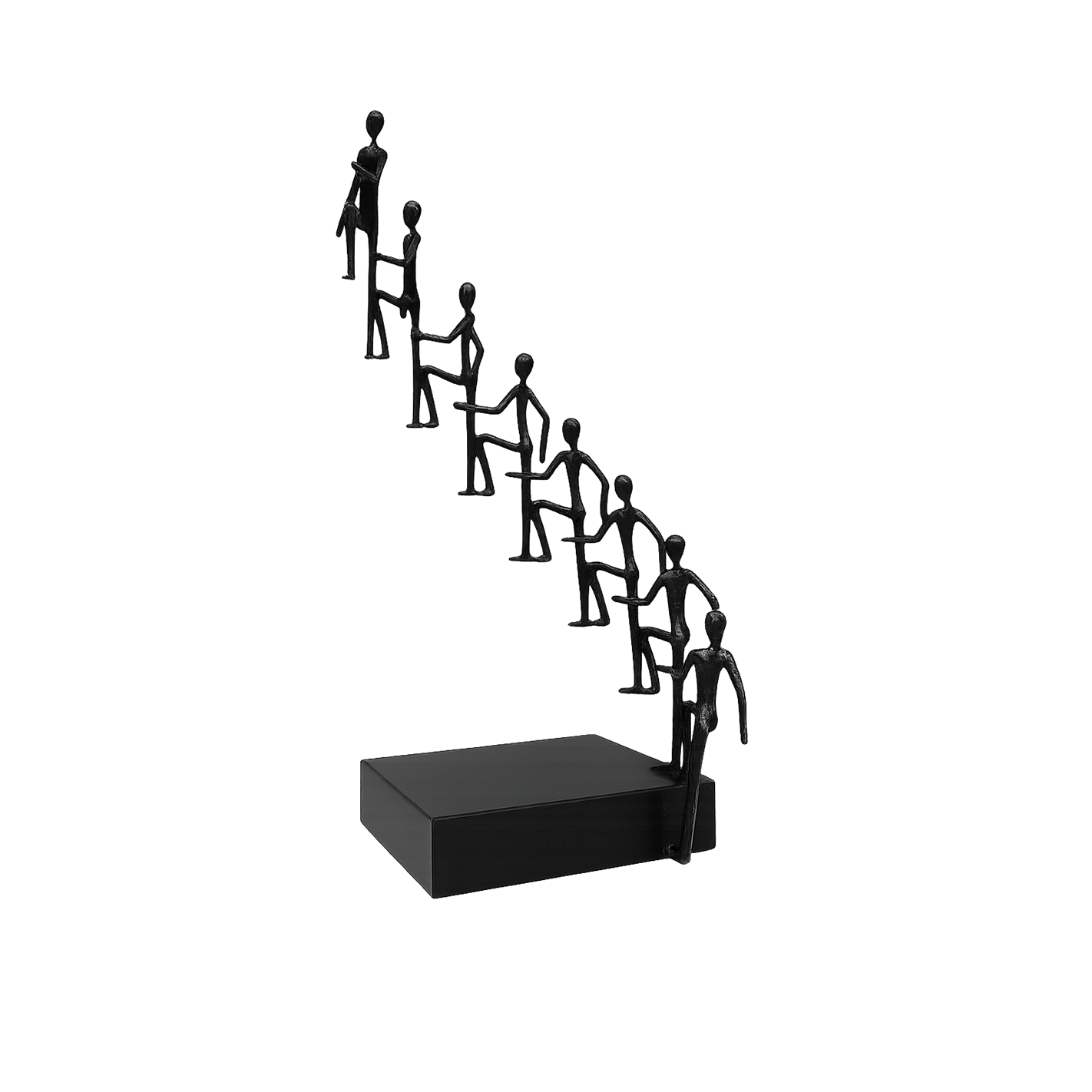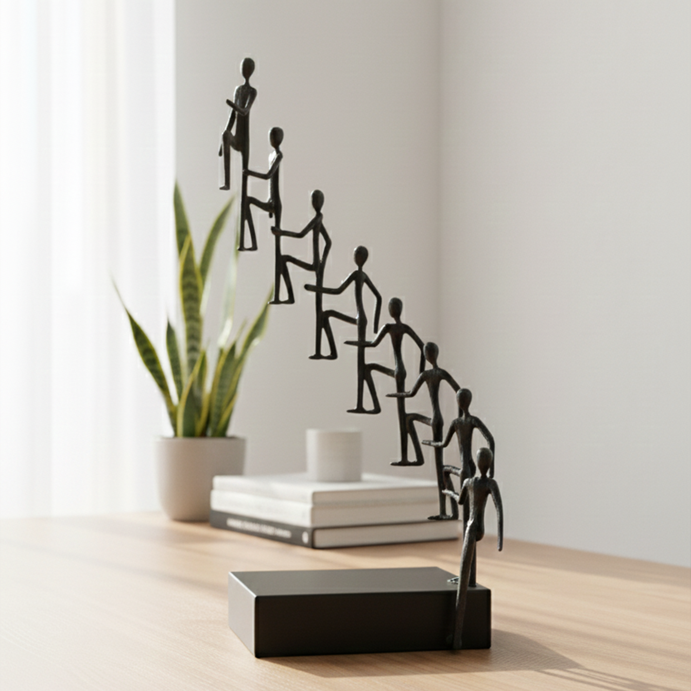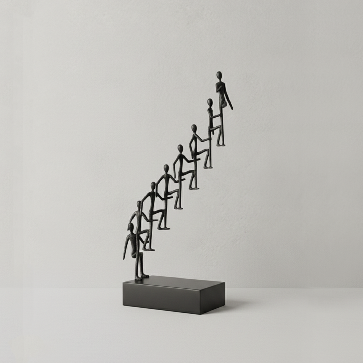 Dalam dunia yang penuh hiruk pikuk dan tekanan, kita sering mencari sesuatu yang mampu menghadirkan ketenangan visual sekaligus inspirasi emosional di dalam ruang pribadi maupun profesional. Wiele Dekorasi Logam lahir sebagai sebuah karya seni yang menembus batas estetika, menghadirkan bentuk visual yang kuat tentang perjalanan manusia yang saling membantu, saling menopang, dan bersama-sama menapaki jenjang menuju tujuan tertinggi. Dengan siluet karakter yang anggun, ramping, dan tersusun naik secara harmonis, karya ini bukan hanya dekorasi, tetapi sebuah simbol keberanian, kontinuitas, dan tekad. Dipahat dengan akurasi artistik melalui pendekatan desain minimalis modern, patung ini menghadirkan aura prestisius, menjadikannya pusat perhatian yang anggun untuk meja kerja, rak pajangan, ruang keluarga, ruang tamu, hingga area lobi perusahaan.