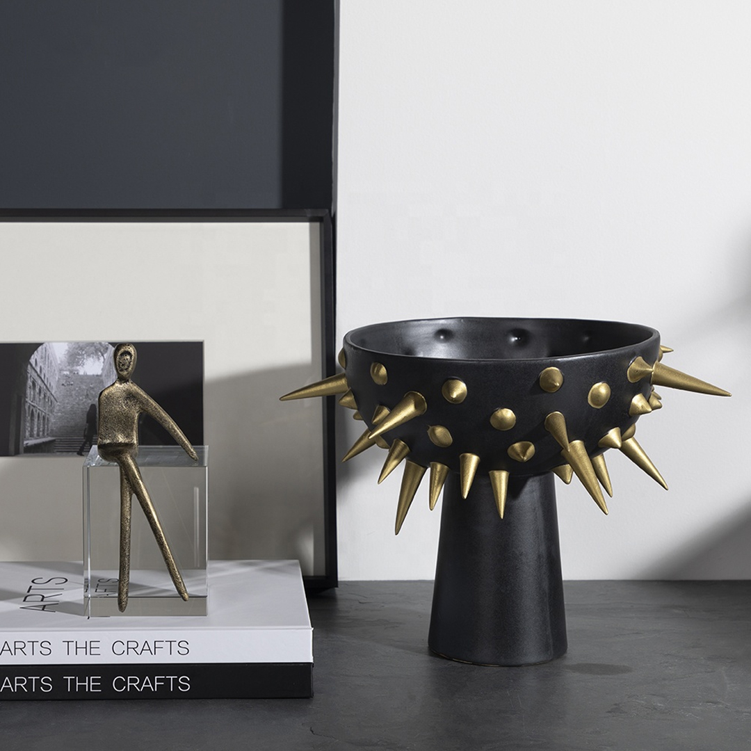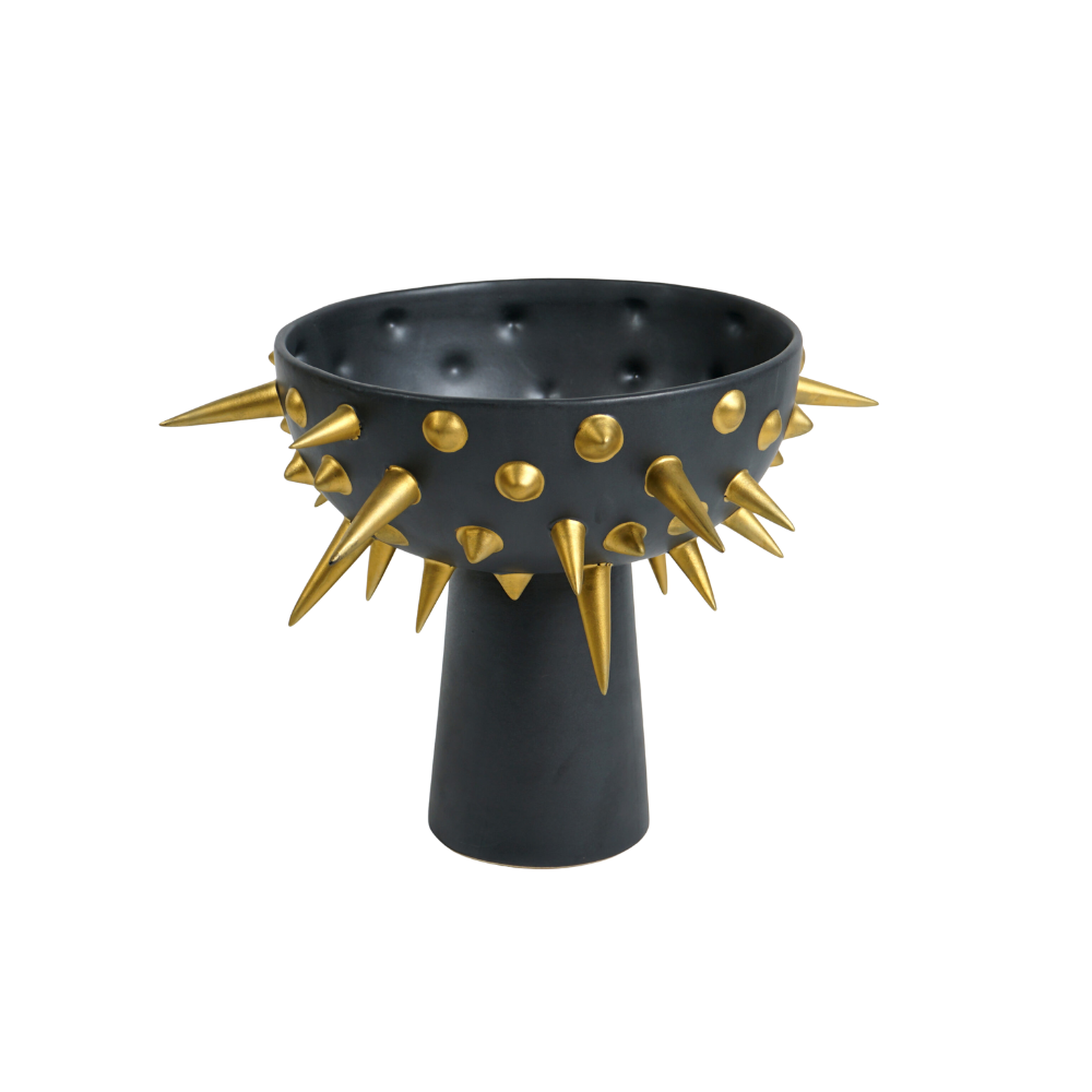 Aksen spike berwarna emas matte tidak hanya berfungsi sebagai dekorasi; mereka adalah bagian integral dari desain yang menghadirkan estetika modern-industrial yang tajam namun tetap mewah. Setiap spike ditempatkan secara manual dengan presisi tinggi agar simetris, stabil, dan tidak mudah terlepas. Aksen emas ini memberikan efek visual dramatis, menciptakan kontras elegan yang terlihat mencolok namun tetap artistik. Ketinggian mangkuk yang berdiri di atas pondasi berbentuk silinder memastikan stabilitas, sehingga mangkuk tidak mudah terguling bahkan ketika diisi penuh.