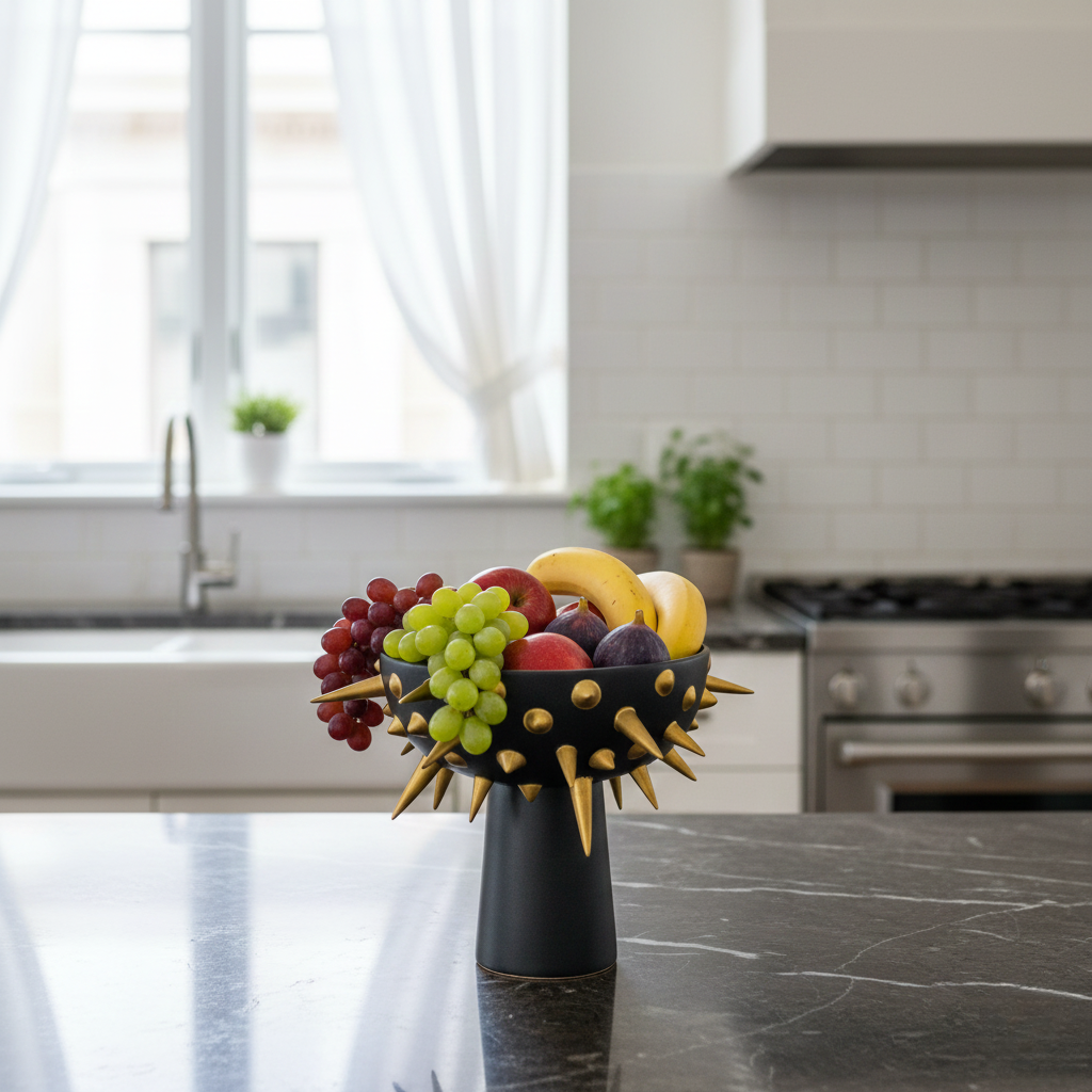 Yayoi Mangkuk Buah menghadirkan perpaduan unik antara seni modern dan kemewahan estetika melalui desain keramik premium yang kokoh dan halus. Permukaan hitam doff yang tegas dipadukan dengan ornamen duri-duri emas menciptakan karakter visual yang berani, dramatis, dan penuh pernyataan. Setiap detail dibuat untuk memikat pandangan, menjadikannya tidak hanya sebuah mangkuk buah, tetapi juga karya dekoratif yang mampu mengangkat kelas ruangan dalam sekejap. Dirancang sebagai pusat perhatian, Yayoi sangat serbaguna untuk menghiasi berbagai ruang—mulai dari meja makan, meja tamu, hingga credenza di ruang keluarga atau area penerima tamu.