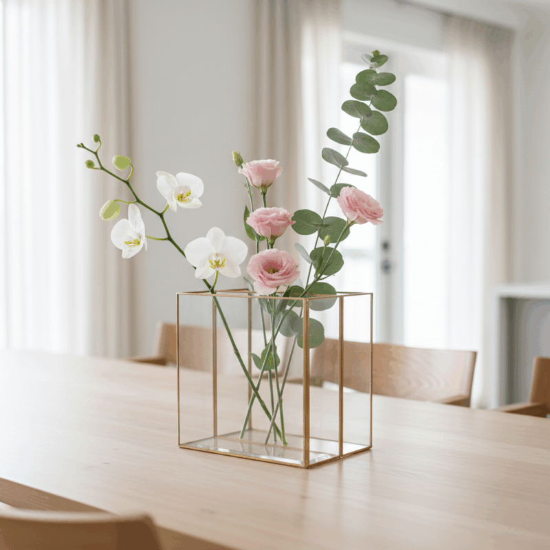 Dengan desain geometris yang bersih, Zweiteil Vas tampil sebagai aksen modern yang tidak bergantung pada tren. Ia tidak berusaha mencuri perhatian secara agresif, tetapi justru memikat lewat ketenangan bentuk dan kejernihan visual. Cahaya yang menembus panel kaca memantul lembut pada rangka emas, menciptakan permainan refleksi yang halus dan menambah kedalaman estetika. Dari sudut mana pun dipandang, vas ini menghadirkan kesan elegan yang konsisten—membuatnya relevan untuk berbagai ruang dan gaya interior.