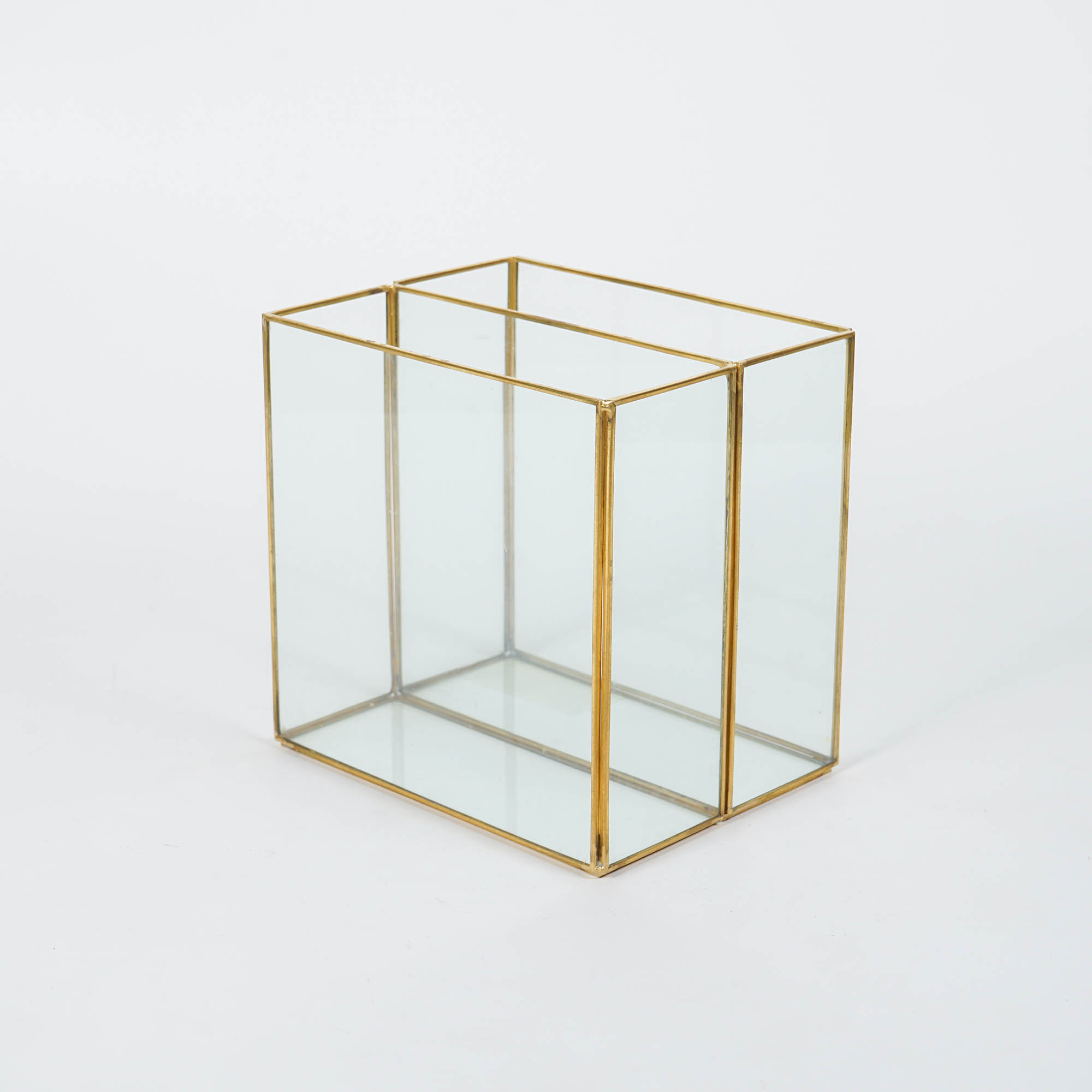 Dengan desain geometris yang bersih, Zweiteil Vas tampil sebagai aksen modern yang tidak bergantung pada tren. Ia tidak berusaha mencuri perhatian secara agresif, tetapi justru memikat lewat ketenangan bentuk dan kejernihan visual. Cahaya yang menembus panel kaca memantul lembut pada rangka emas, menciptakan permainan refleksi yang halus dan menambah kedalaman estetika. Dari sudut mana pun dipandang, vas ini menghadirkan kesan elegan yang konsisten—membuatnya relevan untuk berbagai ruang dan gaya interior.